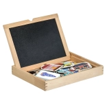 Der Deckel dient als magnetische weiße und schwarze Tafel. Mit dem beiliegenden Marker, den Kreiden und dem Schwamm können Kinder zeichnen, schreiben und alles leicht wieder abwischen.