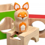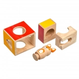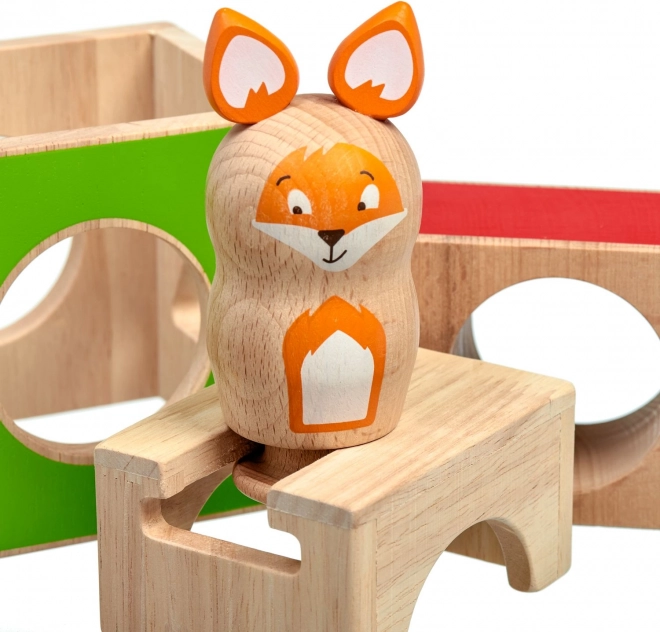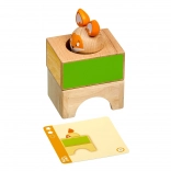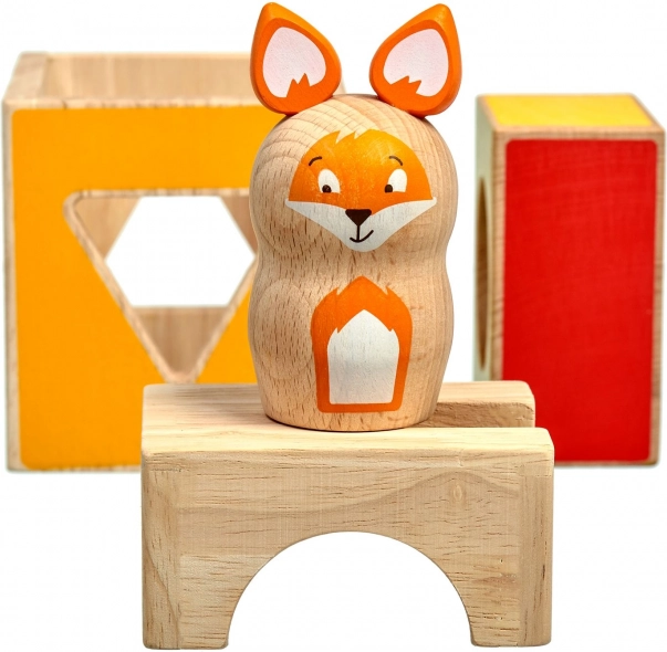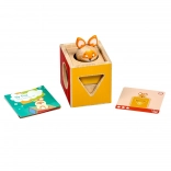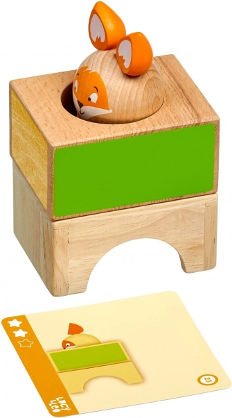 Die Füchsin wird entsprechend der Kartenbilder korrekt zwischen den Blöcken platziert. Kinder verinnerlichen spielerisch den Umgang mit Formen, Farben und räumlichen Beziehungen.