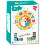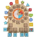 Ein lustiges und lehrreiches Holzspielzeug, das Kinder dabei unterstützt, die Uhr zu lernen, Formen und Farben zu unterscheiden und die Feinmotorik zu trainieren. Bunte Teile mit Zahlen werden in die passenden Aussparungen rund um das Zifferblatt eingesetzt, bewegliche Zeiger helfen beim Uhrenlernen und AM/PM-Würfel erweitern das Lernen um digitale Zeit und Englisch.
