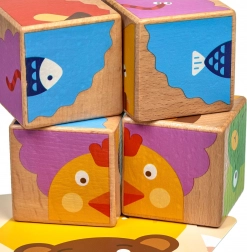 Aus vier Holz-Würfeln setzen Kinder mithilfe der beiliegenden Vorlagen bis zu sechs verschiedene Bilder zusammen. Jede Drehung bringt eine neue, spielerische Aufgabe und hält die Aufmerksamkeit der kleinen Baumeister.