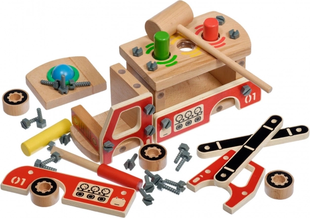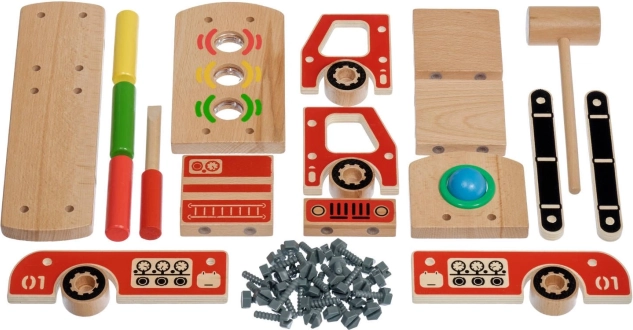 Bauen Sie ein funktionales hölzernes Feuerwehrauto mit Schrauben und Werkzeug. Der Bauprozess fördert logisches Denken und Geduld.