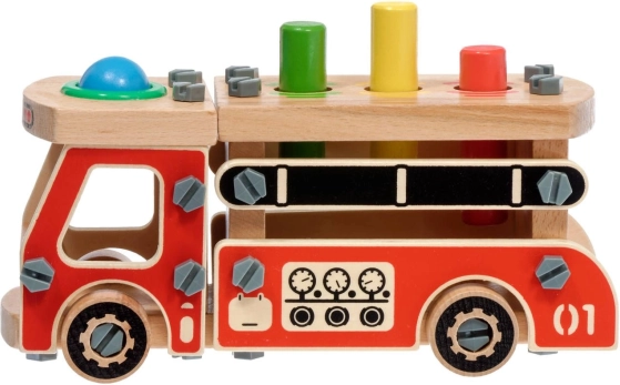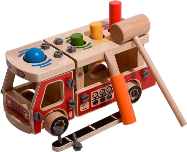 Dieses kreative Set kombiniert Baukasten und Klopfbank in einem. Kinder bauen zunächst ein robustes Feuerwehrauto aus Holz und nutzen anschließend die vier Öffnungen in der Ladefläche zum vergnüglichen Einschlagen farbiger Elemente mit dem Hammer. Dank leuchtender Farben und vielfältiger Formen unterstützt das Spielzeug natürliches Lernen und Konzentration.
