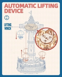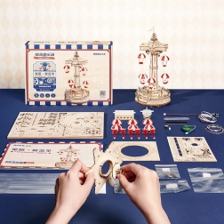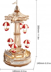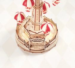 Dieses aufwendig gestaltete 3D-Holzpuzzle ist von einem klassischen Fallschirmturm aus dem Vergnügungspark inspiriert. Die sechseckige Basis und seitliche, lichtdurchlässige Fenster lassen warmes Licht durch und unterstreichen die einzigartige Atmosphäre. Das Karussell wird von einem batteriebetriebenen Motor angetrieben und mit LEDs beleuchtet, während die Touch-Steuerung eine separate Regelung von Bewegung und Klang ermöglicht.