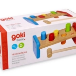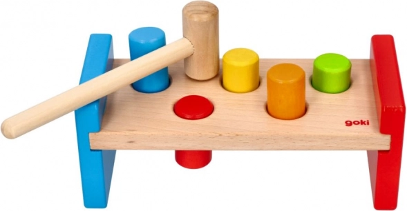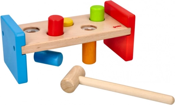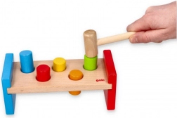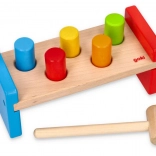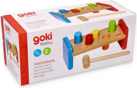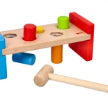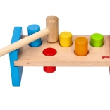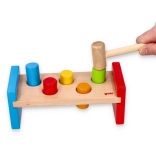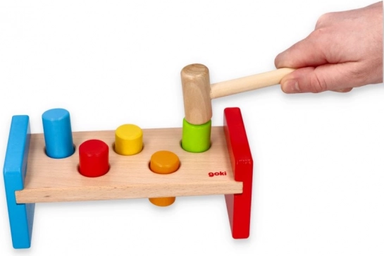Diese robuste Klopfbank besteht aus widerstandsfähigem, glatt verarbeitetem Holz mit sicheren, ungiftigen Farben. Mit dem Holzhammer können Kinder Griff, Schlagkraft und Geduld trainieren, während die farbigen Stifte zu wiederholtem Spiel einladen.
