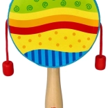 Die traditionelle „Schnurtrommel“ in modernem Design von GOKI ist ein großartiges Begleitinstrument für Kinder. Drehe den Griff, und die roten Perlen an den Schnüren schlagen rhythmisch auf das Trommelfell. Die Drehgeschwindigkeit verändert natürlich Tempo und Klangcharakter, was Hörwahrnehmung und Rhythmusgefühl fördert.