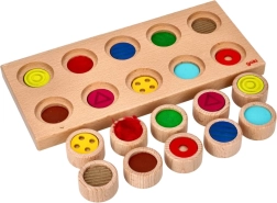 Jeder der 10 Holzzylinder hat eine andere Oberfläche. Kinder trainieren den Tastsinn und das Vergleichen, wenn sie blind die passende Öffnung auf der Platte suchen.