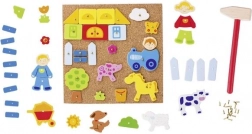 Das Spiel fördert die Feinmotorik und Kreativität von Kindern ab 3 Jahren. Kinder können mit Hammer und Nägeln die Holzformen einfach auf der Korkplatte befestigen und sie wieder zerlegen, was immer wieder zu neuen kreativen Abenteuern führt.