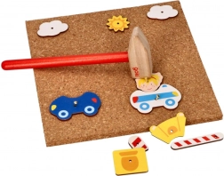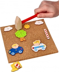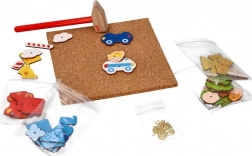 Das Korkhammer-Set Stadt ist ein unterhaltsames und lehrreiches Set für Kinder ab 3 Jahren. Dieses Set enthält bunte Holzformen, die Kinder auf die Korkplatte hämmern können.