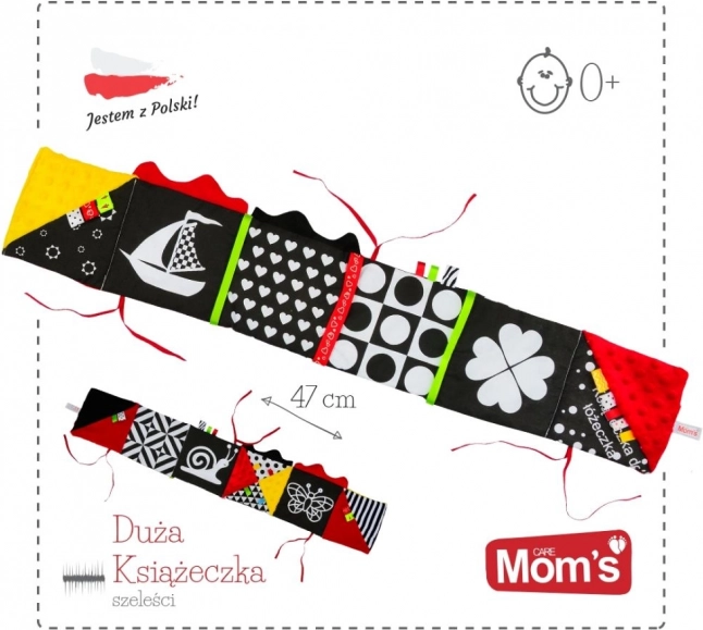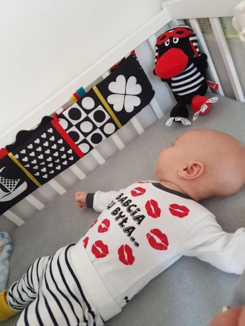 Entdecken Sie sanften, anregenden Spielspaß für die Kleinsten. Dieses sensorische Bettbuch kombiniert Kontrastfarben (Schwarz, Weiß, Rot), verschiedene Texturen und knisternde Elemente zur Stimulierung von Sehen, Tasten und Hören. Dank der Befestigungsschnüre lässt es sich leicht am Bettchen oder Kinderwagen anbringen und dient zugleich als weicher Aufprallschutz. Hergestellt aus sicheren Materialien mit OEKO-TEX-Zertifikat und CE-Konformität.
