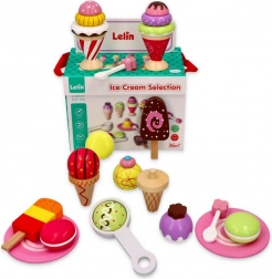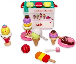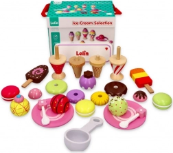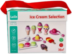 Mit dem eleganten Eiscreme-Set aus Holz der Marke Lelin wird jedes Kind zum Eisverkäufer. Dieses Set enthält 25 bunte Teile und ist ideal für Kinder ab 3 Jahren. Die Spielzeuge sind aus lackiertem Holz gefertigt und in einer stabilen Box mit komfortablem Klappverschluss und Griff für leichtes Tragen verpackt.