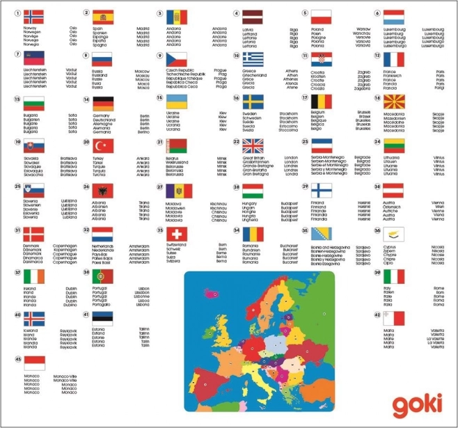 Das Holzpuzzle Europakarte von Goki ist das ideale Lernspielzeug für Kinder und Schulkinder. Die Teile in Form der einzelnen Länder werden in eine robuste Holzplatte mit gefrästen Aussparungen eingesetzt, was die Handhabung erleichtert und die richtige Platzierung fördert. Jedes Land ist nummeriert, und in der Legende finden Sie seinen Namen, die Hauptstadt und die Landesflagge.