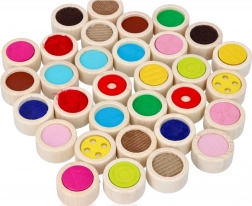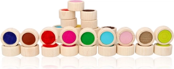 Das hölzerne Tast-Memo-Spiel ist ideal zur Stimulierung taktiler und sensorischer Reize. Die Spielsteine in Form von Zylindern aus massivem Holz haben einen Durchmesser von 4 cm und 16 verschiedenen Oberflächen. Das Spiel kann mit geschlossenen Augen als Herausforderung gespielt werden, um die gleiche Oberfläche zu finden, oder als klassisches Memo, indem die Steine mit der bunten Seite nach unten gelegt werden.