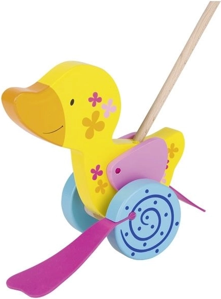 Dieses rollende Spielzeug aus massivem Holz ist so gestaltet, dass es Kinder nicht nur durch sein Aussehen, sondern auch durch seine Bewegung anspricht. Die Ente wackelt, schlägt mit den Flügeln und ihre Beinchen patschen beim Fahren fröhlich auf den Boden. Das fördert nicht nur die kindliche Motorik, sondern auch ihren Gleichgewichtssinn und bietet Freude an Bewegung.