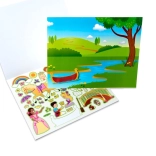 Die Aufkleber lassen sich beliebig oft neu platzieren und verschieben, sodass Kinder die Geschichte leicht verändern und neue Szenen komponieren können.