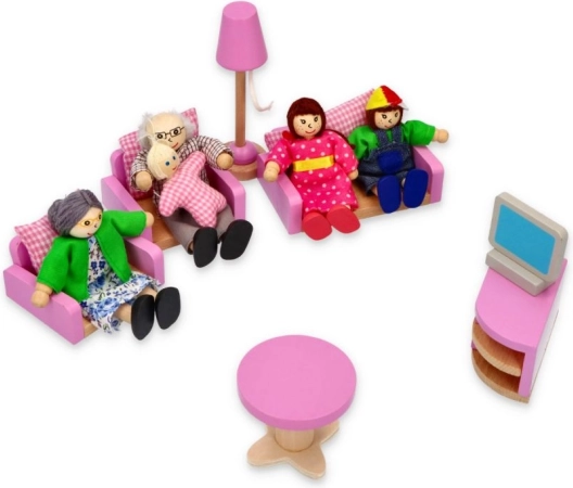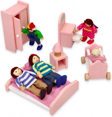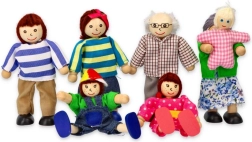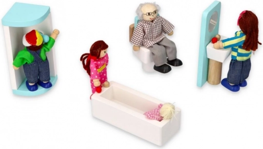 Holzfiguren in farbigem Textil und flexible Arme und Beine erleichtern das Posieren und Sitzen im Puppenhaus.