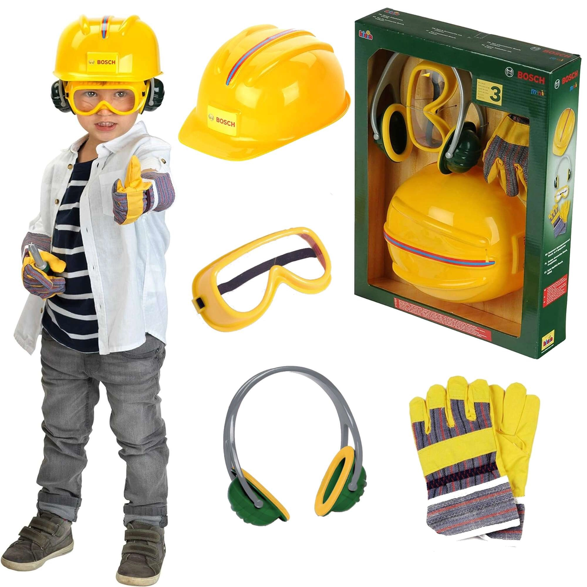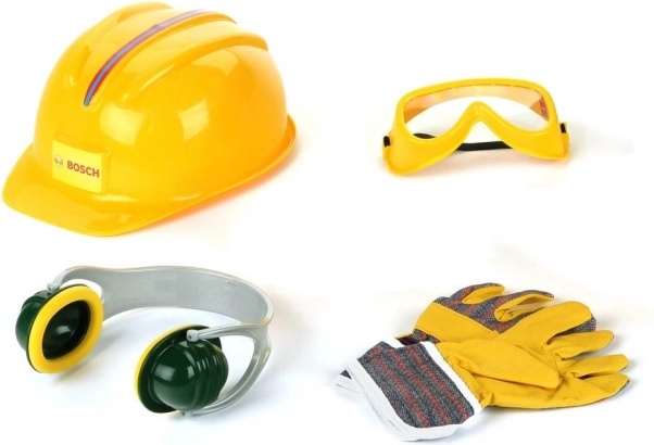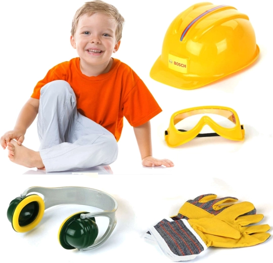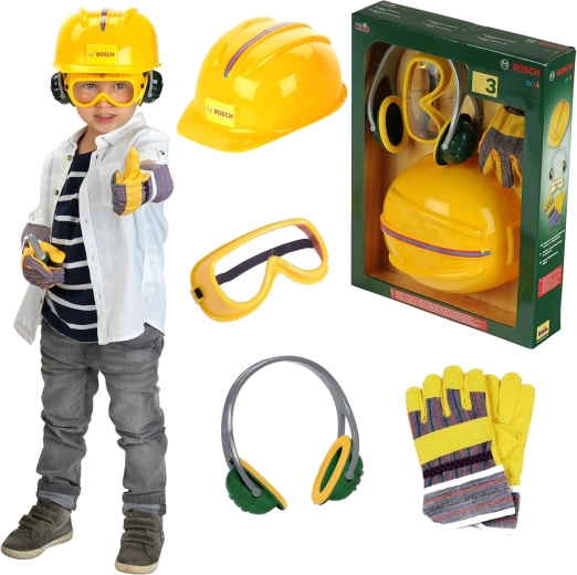 Enthalten sind ein gelber Helm mit verstellbarem Verschluss, gelb-grüner Gehörschutz, gelbe Schutzbrille mit transparenten Kunststoff-„Gläsern“ an einem elastischen Band sowie bequeme Handschuhe in Gelb-Grau. Alles ist leicht, auf Kinderbedürfnisse zugeschnitten und ideal als Ergänzung zu Kinderwerkbänken und Werkzeug-Sets.