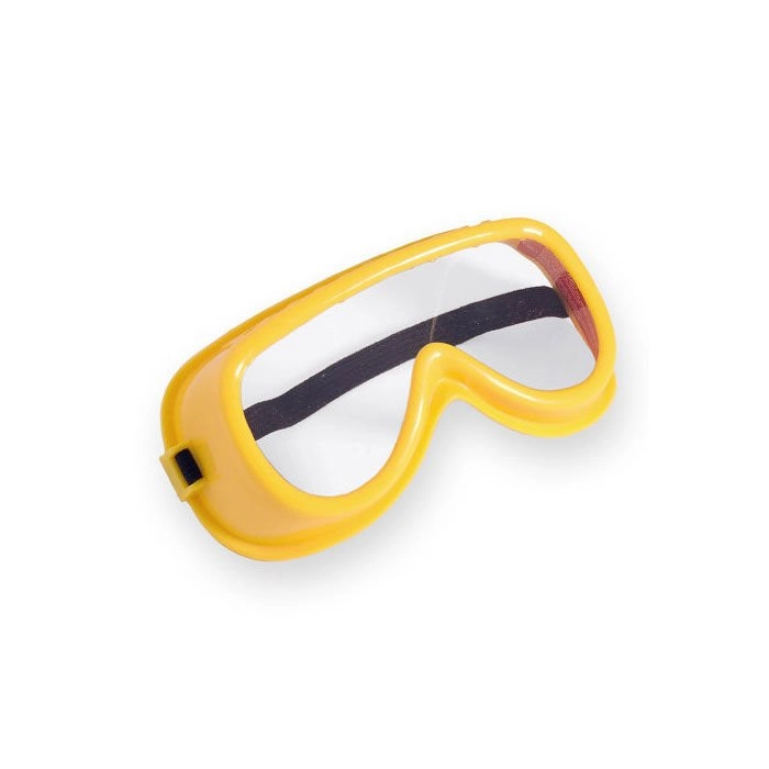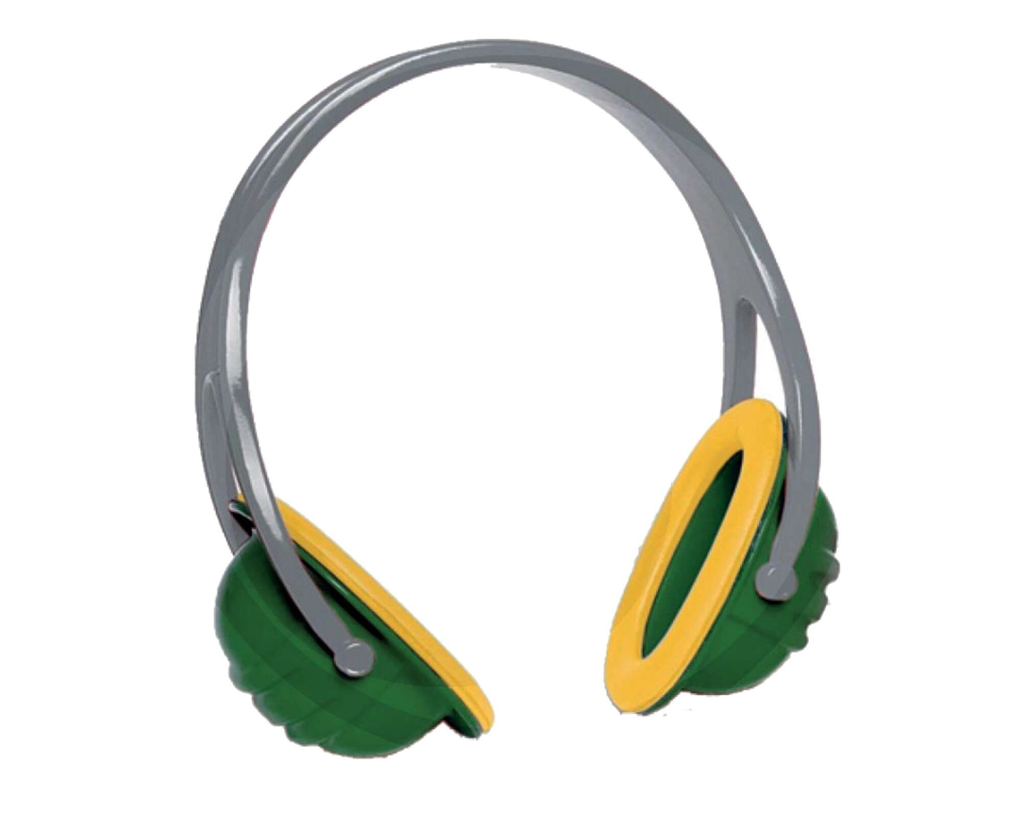 Gelbe Brille mit transparenten Kunststoffgläsern und elastischem Band wird durch leichte Kopfhörer in grün-gelber Ausführung ergänzt – für ein noch realistischeres Spielerlebnis.