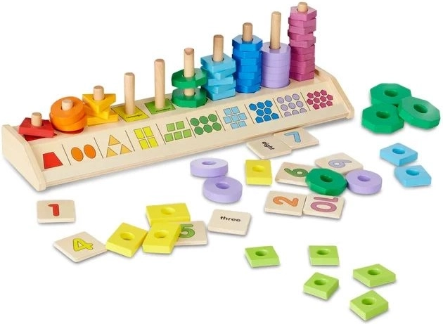 Dieses hölzerne Lernspielzeug verbindet Zählen sowie das Erkennen von Farben und Formen zu einem unterhaltsamen Ganzen. Auf der Holzbasis befinden sich 10 Stifte mit nummerierten Positionen, zu denen Kinder die entsprechende Anzahl von Ringen zuordnen. Jede Ziffer auf dem abnehmbaren Quadrätchen hat die gleiche Farbe wie die Ringe, was das Lernen deutlich übersichtlicher macht.