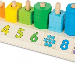Das clevere Holzpuzzle mit zehn Stiften hilft Kindern, von 1 bis 10 zu zählen, Farben und Formen zu erkennen und die Feinmotorik zu fördern. Jeder Zahl entspricht die gleiche Anzahl farbiger Ringe und ein abnehmbares Quadrat mit Ziffer; darunter befinden sich Punkte zur visuellen Kontrolle und auf der Rückseite die englische Schreibweise der Zahl. Das Spielzeug besteht aus umweltfreundlichem Holz und motiviert Kinder dank der kräftigen Farben, spielerisch zu entdecken und zu lernen.