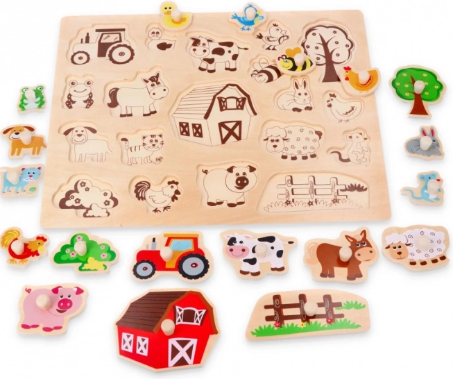 Dieses robuste Holzsteckpuzzle bietet Kindern eine erste Begegnung mit der Welt des Bauernhofs. Farbige, lackierte Teile mit klaren Konturen passen leicht in die Grundplatte aus Naturholz. Dank der Griffe liegen die Teile auch in kleinen Händen gut, was die Feinmotorik und die Geduld fördert.