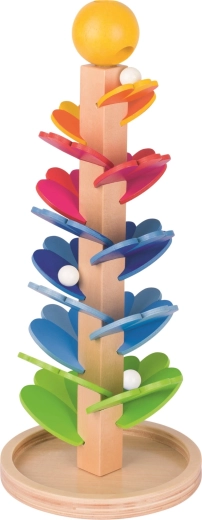 Diese hochwertige Holzspirale der Marke GOKI hat die Form eines Turms mit kaskadenförmig angeordneten, ausgeschnittenen Blättern in verschiedenen Farben. Kinder legen eine Kugel in die Öffnung oben und beobachten, wie sie nach und nach nach unten rollt und dabei zarte, melodische Klänge erzeugt. Das Spielzeug ist so konzipiert, dass es Feinmotorik, logisches Denken und Geduld anregt.