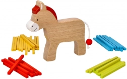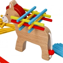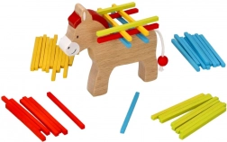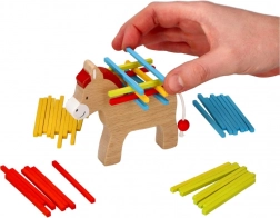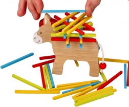 Das Spiel hilft, feinmotorische Fähigkeiten zu entwickeln, indem man die Stäbchen sorgfältig auf den Esel legt.