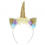 Ein bequemer Haarreif mit glänzendem Horn, glitzernden Öhrchen und bunten Blüten ergänzt das Einhornkostüm perfekt.
