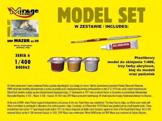 Dieser realistische Bausatz bildet das historische Schiff ORP Mazur von 1939 originalgetreu ab. Dank der beiliegenden Farben, des Klebers und des Pinsels können Sie direkt nach dem Auspacken loslegen. Der Maßstab 1:400 bietet ein ausgewogenes Verhältnis von Detailtreue und Zugänglichkeit für komfortables Bauen und Präsentieren.