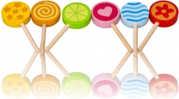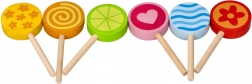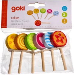 Entdecken Sie die Freude an bunten und hölzernen Lutschern von Goki. Dieses Set umfasst sechs verschiedene Designs, darunter Streifen, Blumen und Herzen. Jedes ist ideal für die kindliche Fantasie und gleichzeitiges Spielen.