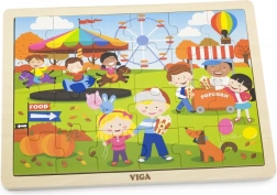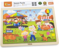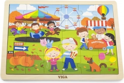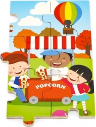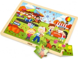 Entdecken Sie ein hochwertiges Holzpuzzle für Kinder mit einer fröhlichen Szene eines herbstlichen Jahrmarkts. Dank 24 robusten Teilen und dem Rahmen lässt es sich auch von jüngeren Kindern hervorragend zusammensetzen; beim Spielen trainieren sie auf natürliche Weise die Hand-Auge-Koordination sowie das Erfassen von Formen und Farben.