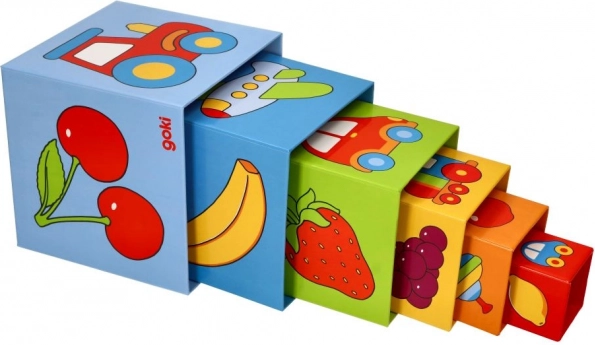 Der GOKI-Stapelturm aus Würfeln ist ein großartiges erstes Konstruktionsspiel für die Kleinsten. Kinder können die Würfel aufeinanderstapeln, ineinanderstecken und dabei niedliche Illustrationen von Obst, Fahrzeugen, Spielzeugen und Tieren entdecken. Dank des stabilen Kartons halten die Würfel dem täglichen Spielen stand und sind zugleich leicht und sicher für kleine Hände.