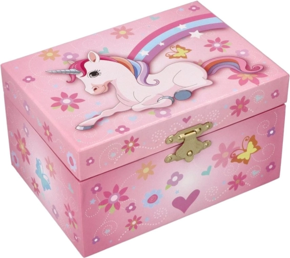 Dieses Spieluhr-Schmuckkästchen erfreut jede kleine Dame. Innen befinden sich ein Spiegelchen und eine niedliche Einhornfigur, die sich beim Öffnen des Deckels zur Melodie von Schwanensee zu drehen beginnt. Das Innere ist mit weichem Stoff ausgekleidet, damit Ketten, Armbänder oder Ringe sicher aufbewahrt sind.