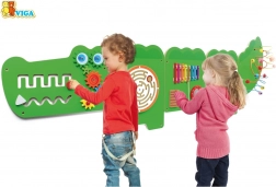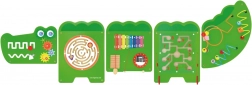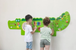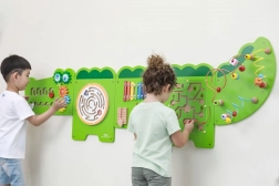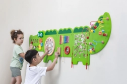 Die Wandtafel „Krokodil“, aufgeteilt in fünf Bereiche, bietet Kindern verschiedene Aktivitäten: Kopfteil mit Labyrinthen und Zahnradgetrieben, ein rundes Kugellabyrinth, ein Musikpanel mit buntem Xylophon und Riffeloberfläche, ein magnetisches Labyrinth mit zwei Magnetstiften sowie ein Schwanzteil mit drei 3D-Perlenbahnen. Jeder Abschnitt fördert andere Fähigkeiten und motiviert Kinder zum Entdecken.