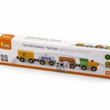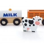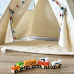 Das Set enthält eine Lokomotive und drei Waggons – eine mit MILK gekennzeichnete Cisterne, einen Viehwagen mit Kuh und einen Güterwagen. Glatte Kanten und robuste Ausführung sind ideal fürs Kinderzimmer und für Kindergärten.