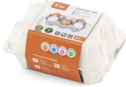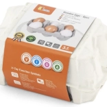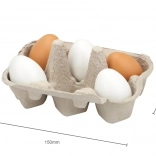 Das Set enthält 6 Holzeier in einer praktischen Kartonschale, die eine echte Verpackung realistisch nachbildet. Kinder können Erwachsene beim Kochen nachahmen, im Kinderladen „einkaufen“ oder in der Spielküche Speisen servieren. Das robuste Material und die glatte, lackierte Oberfläche sind angenehm zu berühren und leicht zu pflegen.