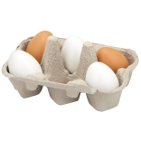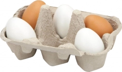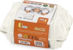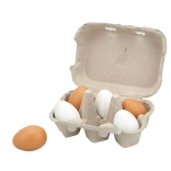 Sechs Holzeier in einer Kartonschale sehen wie eine echte Packung aus. Ideal für die Kinderküche und den Marktstand.