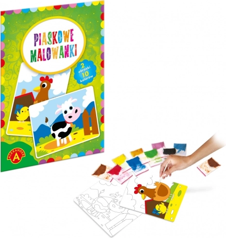 Das kreative Spiel mit dem Sandmalen besteht darin, nacheinander die einzelnen vorgeschnittenen Teile des Bildes freizulegen, um die klebrige Oberfläche des ausgewählten Fragments zu enthüllen. Jedes freigelegte Fragment wird mit Sand in der Farbe entsprechend der im Anleitungsmuster und auf der Schachtel angegebenen Bildvorlage bestreut.
