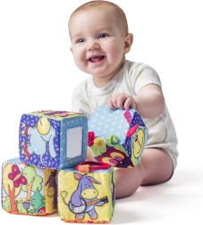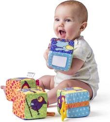 Die kuschelweichen Textilwürfel NINY bieten Spaß und fördern die Sinne von Geburt an. Sie enthalten Rasseln, Quietscher, Beißringe, ein Spiegelchen aus Sicherheitsfolie sowie Elemente aus knisterndem Papier, die Feinmotorik und sensorische Wahrnehmung unterstützen.