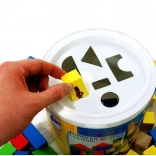 Der Eimerdeckel enthält Formöffnungen, in die Kinder die passenden Bausteine einsetzen. Das unterstützt die Entwicklung der Fähigkeit zur Form- und Mustererkennung.