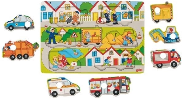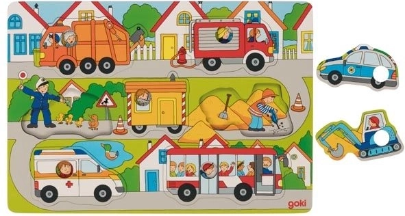 Dieses bunte Kinderpuzzle mit Fahrzeugen ist so gestaltet, dass Kinder neue Kenntnisse entdecken. Jedes Teil hat eine runde Aussparung für einfaches Herausnehmen und verbirgt ein weiteres Bild, das nach dem Herausnehmen erscheint. Kinder sind begeistert vom Entdecken und haben Spaß daran, was auf den Straßen passiert.