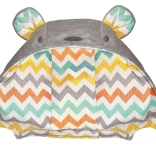 Der Tragegurt enthält eine abnehmbare Kapuze mit einem verspielten Bärenmotiv und Ohren, die das Kind schützt, ohne die Sicht zu verdecken.