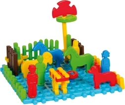Enthalten sind eine Unterlage von 37 × 37 cm, Figuren der Familie und Tiere sowie verschiedene Bauelemente, die zu offenem Spiel inspirieren. Kinder können Schafe füttern, Pferde auf die Weide führen oder den Zaun „reparieren“ – die Möglichkeiten sind endlos.