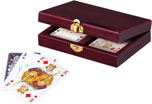 Luxuskarten in einer eleganten Holzkiste bieten zwei Sets außergewöhnlicher Karten der Marke Piatnik. Jedes Set enthält 55 Karten, was dieses Set zu einem idealen Geschenk für erfahrene Spieler macht.