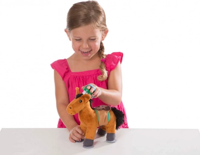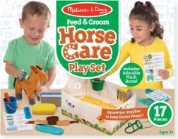 Dieses Pflegeset mit einem weichen Plüschpferd ist das ideale Spielzeug für kleine Pferdefans. Enthaltenes Zubehör wie Bürste, Schwamm, Karotte und Futtertrog unterstützt realistische Bauernhof-Spiele und das Lernen der Tierpflege. Dank der bunten Farben und angenehmen Materialien werden Kinder das Spielen lieben.