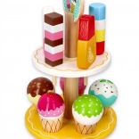 Dieser Holzstand ist mit vielen bunten Eiscremes und Eislutschern ausgestattet, die wie echt aussehen. Er ist so gestaltet, dass er die fantasievolle Spielweise der Kinder anregt.