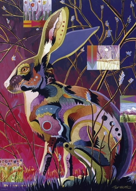 Dieses Design-Puzzle präsentiert eine ausdrucksstarke, dekorative Komposition des Künstlers Bob Coonts, der in den Rocky Mountains lebt und für seinen farbenfrohen Stil bekannt ist, der die Schönheit der Tiere einfängt. Das Kaninchenmotiv erfreut Naturliebhaber und Sammler origineller Illustrationen.