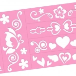 Wiederverwendbare Schablonen mit Blumen, Herzchen und Schmetterlingen erleichtern ein schnelles und sauberes Nachzeichnen beliebter Motive.