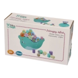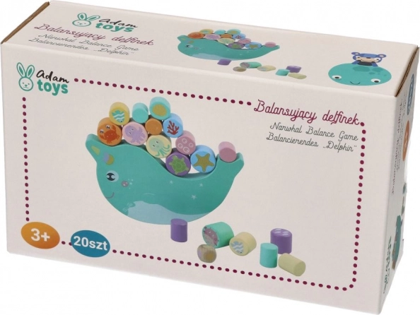 Kinder stapeln Holzzylinder auf eine schaukelnde Basis in Form eines Narwals und trainieren Feinmotorik, Koordination sowie das Einschätzungsvermögen. Jeder Zug ist eine Herausforderung, die Stabilität zu bewahren.