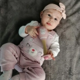 Das fröhliche rosafarbene Design mit Häschen begeistert Kinder auf den ersten Blick und unterstützt ihre visuelle Wahrnehmung.