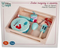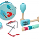 Tamburin mit Fuchs-/Eichhörnchenmotiv, Maracas, Triangel, Mundharmonika und weitere Instrumente in angenehmen Minzfarben fördern Taktgefühl und Hand-Koordination.
